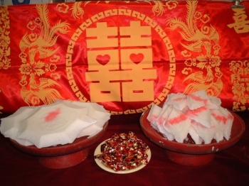 A是男方娶親前一天前往女方家裡饋贈的一種「喜糖」,完整的合婚糖應該影八塊八卦形大糖,和八十塊菱形小糖。